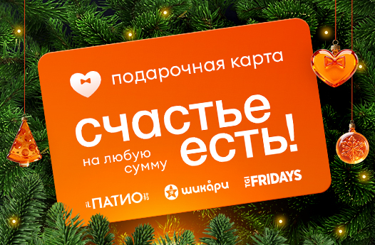 В преддверии Нового года мы предлагаем подарок, который сочетает в себе вкус, стиль и настоящую заботу. Подарочный сертификат «Счастье есть» в iL Патио, Шикари или TGI Fridays — это элегантный способ выразить внимание, оставить впечатление и подарить эмоции.